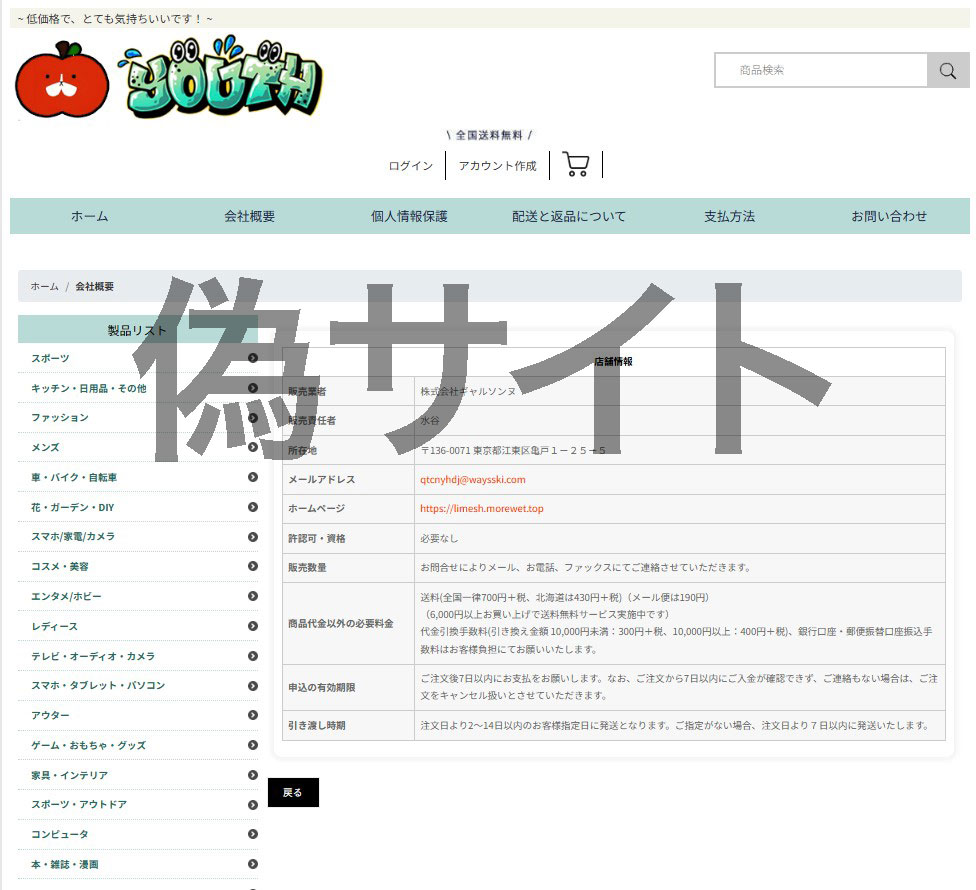 この度、当社名および当社情報(会社名、住所、電話番号など)を無断で詐称・使用した「偽ECサイト(詐欺サイト)」が存在することが確認されました。この偽サイトは当社とは一切関係ございません。